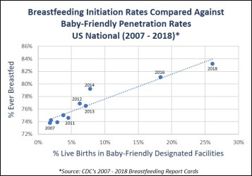 Of course, there are many factors responsible for the rise in breastfeeding rates in the US, which began well before the BFHI started to take hold in this country. We have never claimed that the BFHI is the only factor and also made no claim that the increase in BFHI during the period in question caused the concurrent rise in breastfeeding initiation rates during that time. In fact, our article specifically states that “we cannot infer causality” in the very first sentence after this chart is presented. Our sole objective was to reveal the false claim made by the authors of the Journal of Pediatrics study that there was no correlation between the percent of live births occurring at Baby Friendly facilities and the percent of babies “Ever Breastfed.” As our article outlines, a complete and statistically sound examination shows that there was, in fact, a clear correlation.