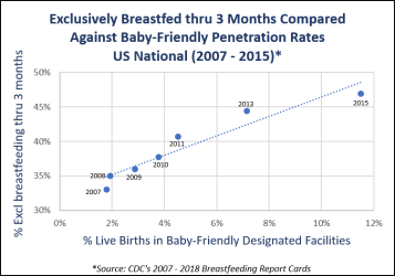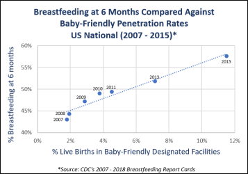 The chart is different, but the conclusion is the same: higher Baby-Friendly penetration rates are indisputably correlated with higher breastfeeding initiation rates across the country and across time.