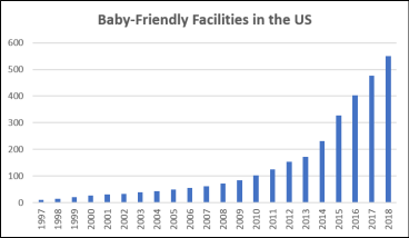 And in 2018, BFUSA celebrated two major milestones: 500 Baby-Friendly designated facilities and one million babies born each year in Baby-Friendly designated facilities in the US. The number of Baby-Friendly facilities in the US has grown 69% since the beginning of 2016 and is continuing to grow at a steady pace, as the above diagram demonstrates.