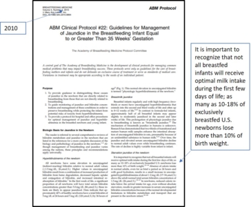 The ABM’s 2010 “Clinical Protocol #22: Guidelines for Management of Jaundice in the Breastfeeding Infant Equal to or Greater Than 35 Weeks’ Gestation” contains the following statement: