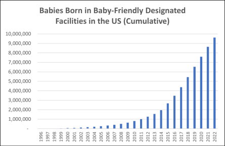 These changes have contributed to a significant increase in breastfeeding rates in the US. Over the past 15 years, while the percentage of facilities in the US that are Baby-Friendly designated increased from less than 5% to more than 20%, the percentage of babies “ever breastfed” increased from 74% to 82%, according to data from the CDC (see chart below left). Since 1996, when the first hospital in the United States was designated Baby-Friendly, nearly 10 million babies have been born in Baby-Friendly designated facilities in the US (see chart below right).