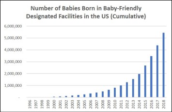 It is safe to say that the Ten Steps have crossed the Tipping Point in the US. Since 1996, when the first hospital in the United States was designated Baby-Friendly, more than 5 million babies have been born in Baby-Friendly designated facilities in the US. 25% of annual births in the US occur in Baby-Friendly® designated facilities and many more occur in facilities enrolled in a state-sponsored programs implementing some or all of the Ten Steps.
